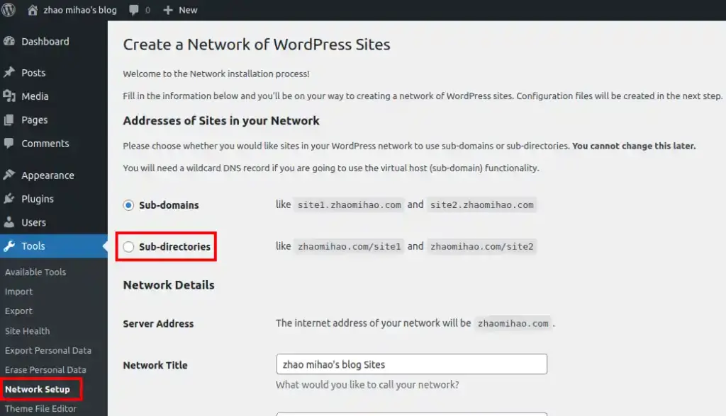 To get started, log in to your WordPress Dashboard. Navigate to Tools → Network Setup. You should see a screen similar to the one below: